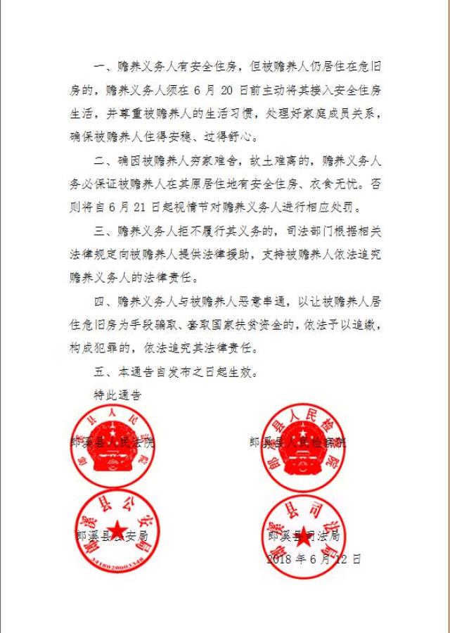二、确因被赡养人穷家难舍,故土难离的,赡养义务人务必保证被赡养人在其原居住地有安全住房、衣食无忧。否则将自6月21日起视情节对赡养义务人进行相应处罚。
