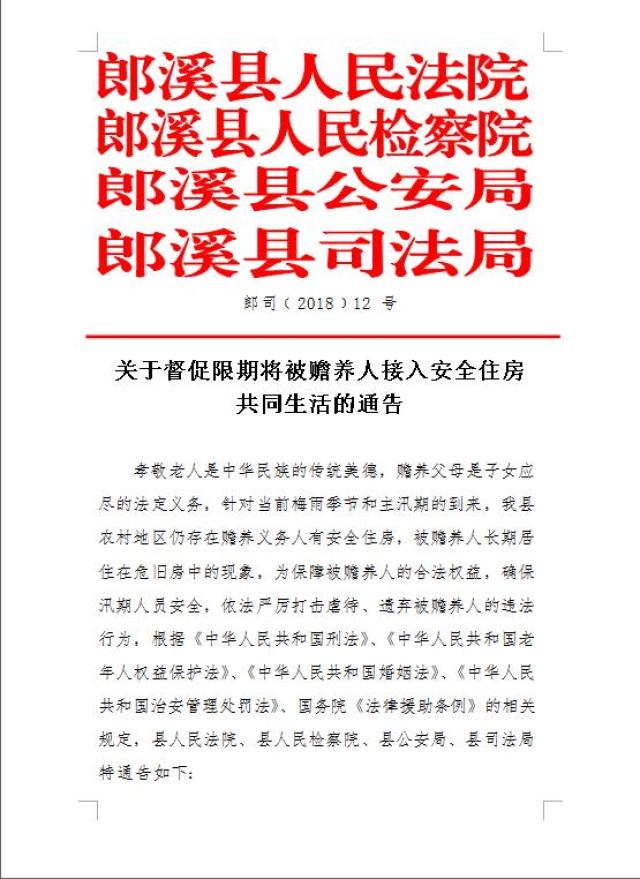 孝敬老人是中华民族的传统美德,赡养父母是子女应尽的法定义务,针对当前梅雨季节和主汛期的到来,我县农村地区仍存在赡养义务人有安全住房,被赡养人长期居住在危旧房中的现象,为保障被赡养人的合法权益,确保汛期人员安全,依法严厉打击虐待、遗弃被赡养人的违法行为,根据《中华人民共和国刑法》、《中华人民共和国老年人权益保护法》、《中华人民共和国婚姻法》、《中华人民共和国治安管理处罚法》、国务院《法律援助条例》的相关规定,县人民法院、县人民检察院、县公安局、县司法局特通告如下: